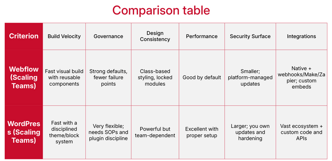 Webflow: Fast visual build, strong component reuse, tidy governance, smaller maintenance footprint.