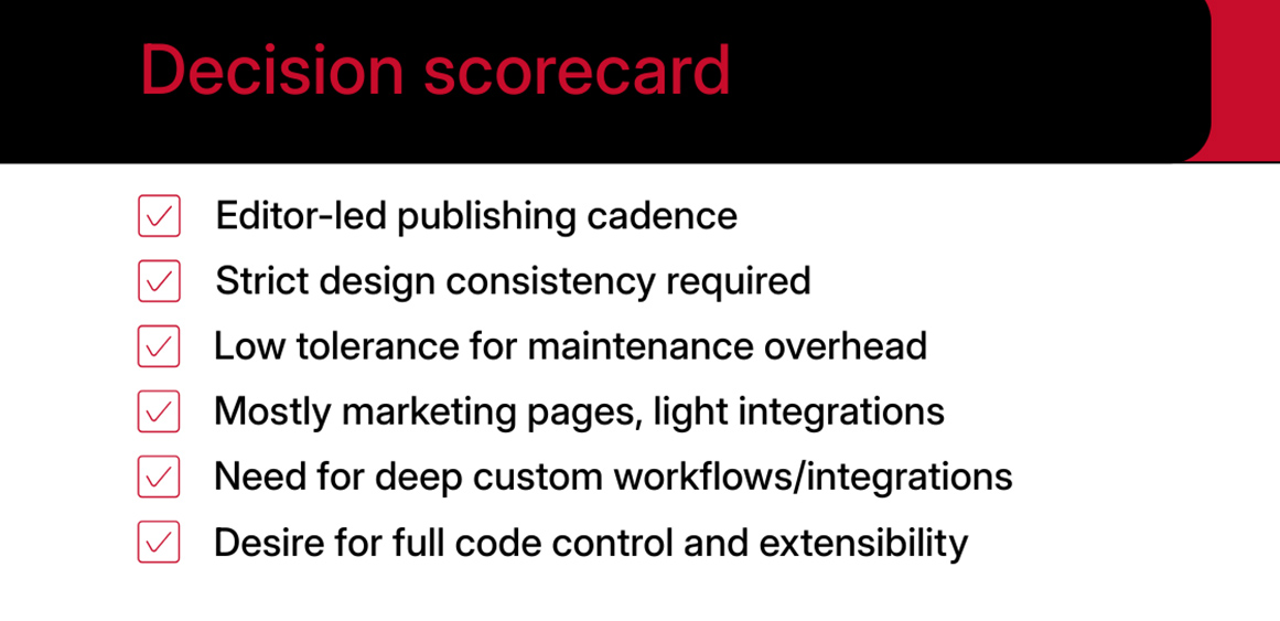 If you ship often with many hands in the CMS, you need strong guardrails and low variance. If your site will house custom workflows and systems, you need depth and control.